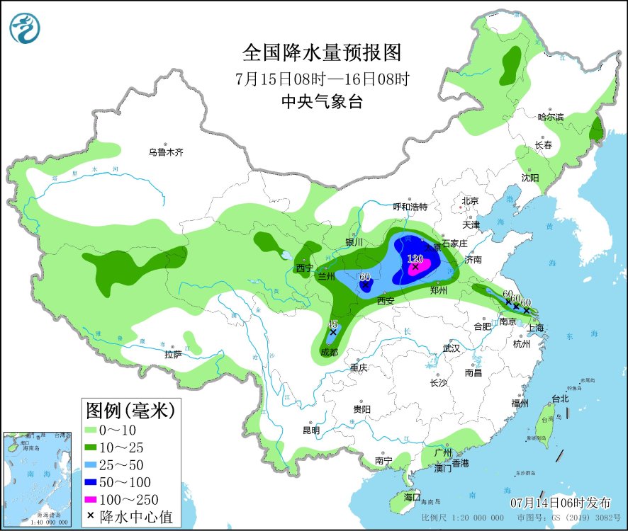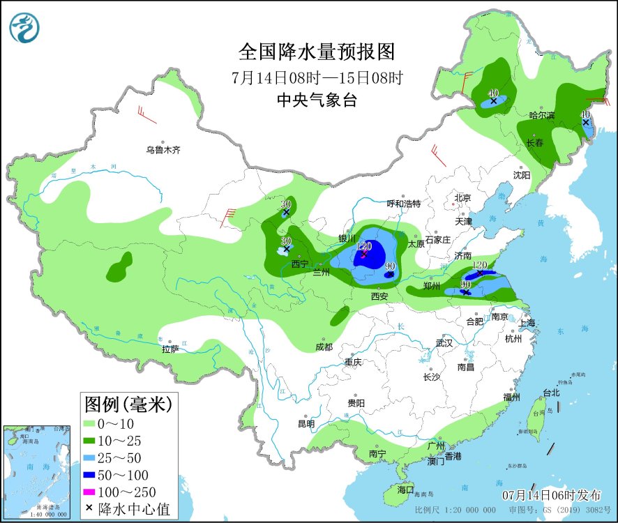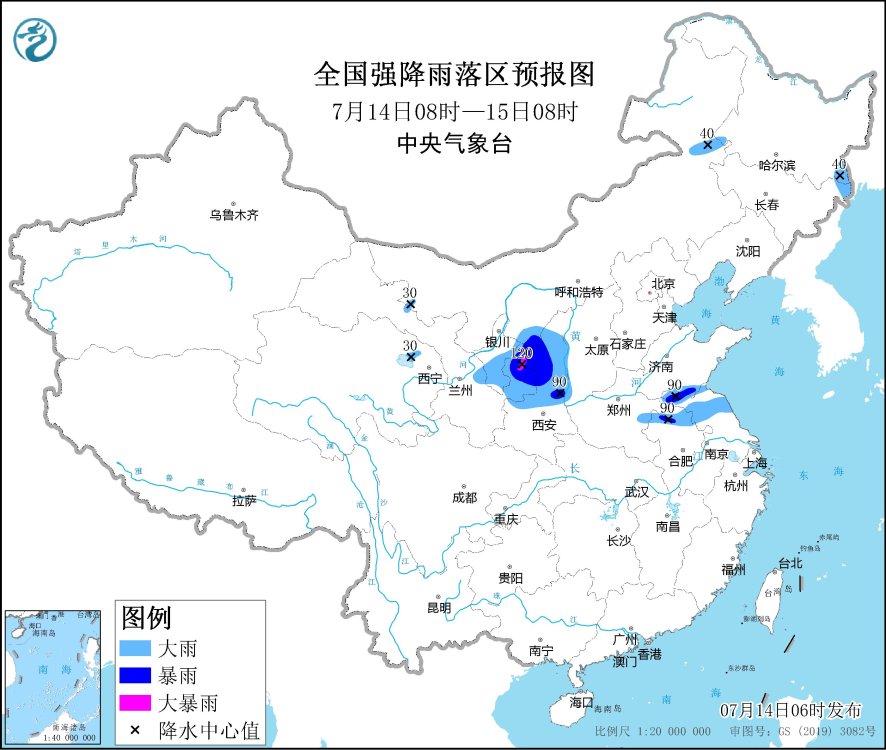 预计,7月14日08时至15日08时,西北地区东部、江苏北部、安徽北部等地部分地区有大到暴雨,其中,甘肃东部、陕西北部等地局地有大暴雨(100~120毫米)。上述部分地区伴有短时强降水(最大小时降雨量20~50毫米,局地可超过60毫米),局地有雷暴大风等强对流天气