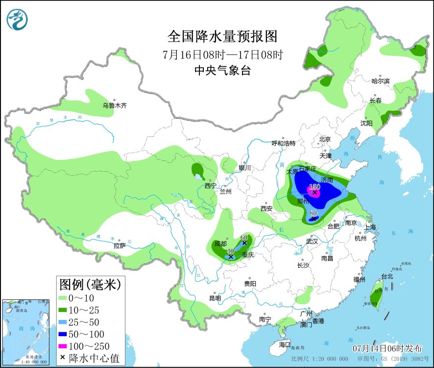 7月16日08时至17日08时,华北南部、黄淮大部、江淮大部、四川盆地南部、台湾岛中南部等地部分地区有中到大雨,其中,山西东南部、河北南部、山东西部、河南东北部和南部、安徽北部、江苏北部等地部分地区有暴雨或大暴雨(100~150毫米)(见图5)。